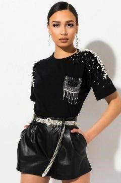 สไตล์ที่ 25 อีกหนึ่งลุคที่ดูแพงมากๆ คือการนำเสื้อยืดมาตกแต่งลูกลูกปัดหรือไข่มุก ใส่คู่กับกางเกงขาสั้นสีดำมันเงา คาดด้วยเข็มขัดที่เป็นเพชร ก็สามารถยกระดับเสื้อยืดธรรมดาให้ดูดี ดูแพงมากๆแถมยังสวยเก๋ไม่ซ้ำใคร